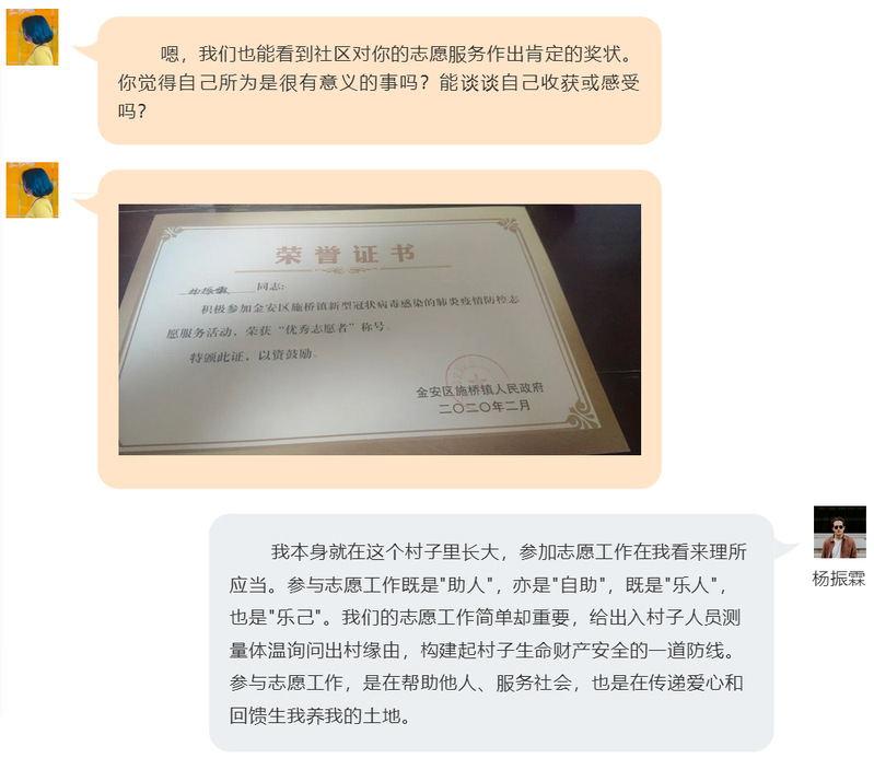 我们力学院的杨振霖同学就是其中一员。正如他自己所说:“本以为会安安静静宅完整个假期,但当村里下发招募志愿者的通告,我和村里的其他孩子一起报名了,既可以为村子为社会做做贡献,也能顺便拯救一下宅在家快要发霉的我们。志愿活动的地点在我们村的必经之路上,村子里在这里设立志愿者摊位。我们拿着登记表和体温计,对过往的行人记录排查。我们早上六点多起床,匆匆吃完早饭后赶往摊位,一般工作到天黑,七点多停止。感谢能有一个机会服务大家,而且这些天过的不算辛苦,非常充实。”