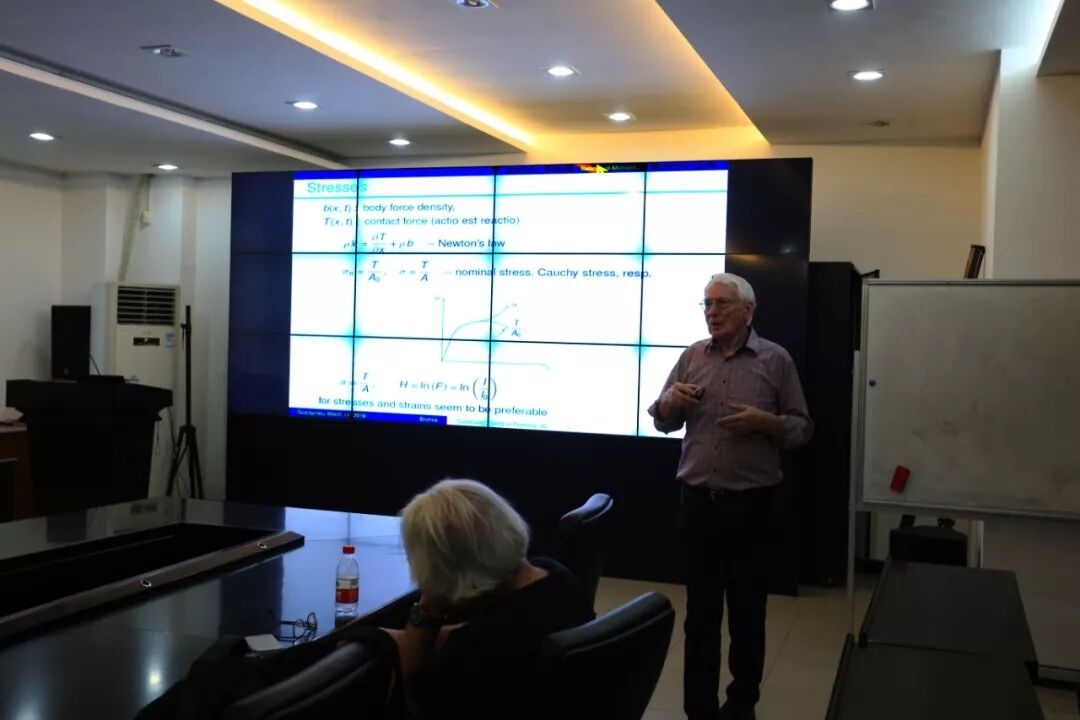 2019年3月15日至3月19日,来自德国波鸿鲁尔大学的Dr.Otto T.Bruhns教授应邀前来beat365正版唯一官网必一开展学术讲座活动。Otto T.Bruhns教授是德国塑性力学领域的资深专家,曾和肖衡教授有很长的共事经历。Otto T.Bruhns教授主要给大家讲解的是塑性力学的发展史以及一些最新的研究理论。