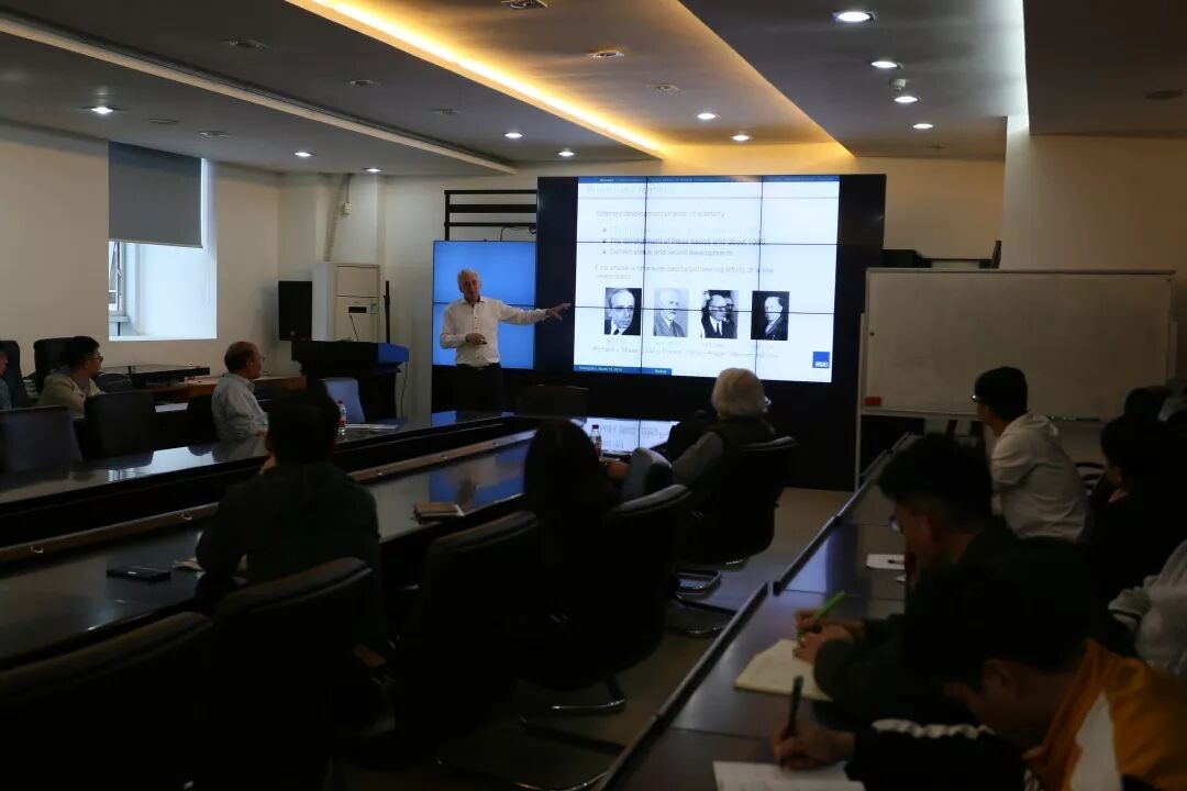 在第一天的讲座中,Otto T.Bruhns教授生动形象地为同学们讲述了塑性力学的发展过程,介绍了几位早期的力学家做出的不朽贡献,激起了在场同学们的兴趣。而在第二天的讲座中,他更深入地讲解了塑性力学的相关理论,特别介绍了弹性变形下方法经典塑性力学中的增量理论——Prandtl-Reuss理论。最后一天,Otto T.Bruhns教授给大家简单介绍了塑性力学中一维条件的连续理论,并在讲座的最后表示他很高兴能收到邀请,跨越远洋来到这里,向各位老师同学介绍他的研究,让大家了解他的工作。