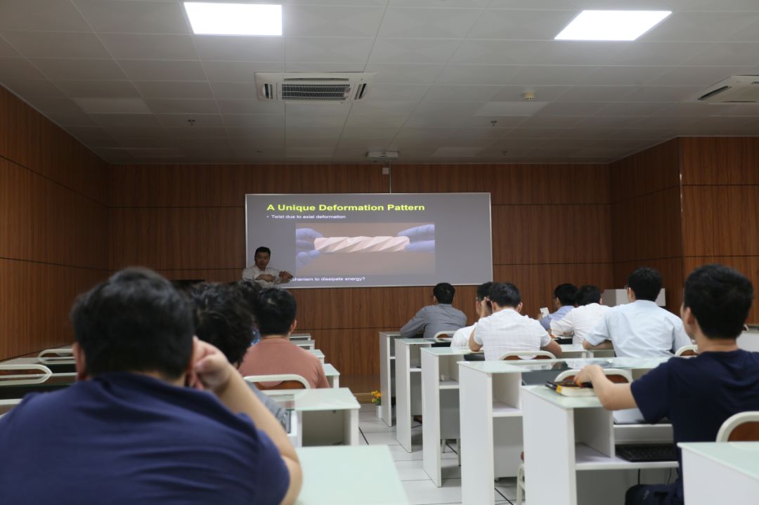 黄世清首先向大家介绍了姜汉卿教授的研究经历及学术成果,并对姜汉卿教授的到来表示了热烈的欢迎。姜汉卿教授从普通折纸出发,引出如何从折纸中创新材料的论题,逐步深入,讨论了折纸中容易被忽视的力学问题。姜汉卿教授用桁架结构为大家搭建了三维可变形折纸的力学模型,从能量的角度分析了折纸技术中的单稳态、双稳态问题,基于此提出了设计和制造可控展开与折叠的新型超材料问题,并对结构实体模型的建立与实验做了详细讲述,为大家呈现了从提出问题、解决问题到获得实际成果的整个研究过程。
