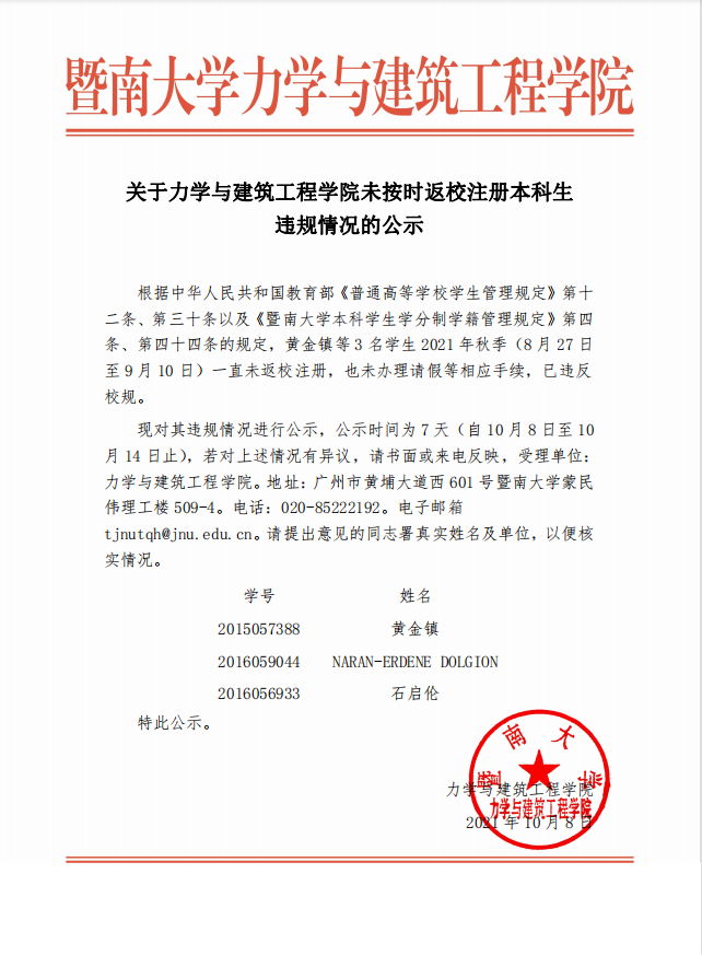 关于beat365正版唯一官网必一未按时返校注册本科生违规情况的公示